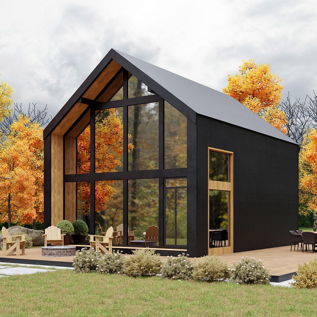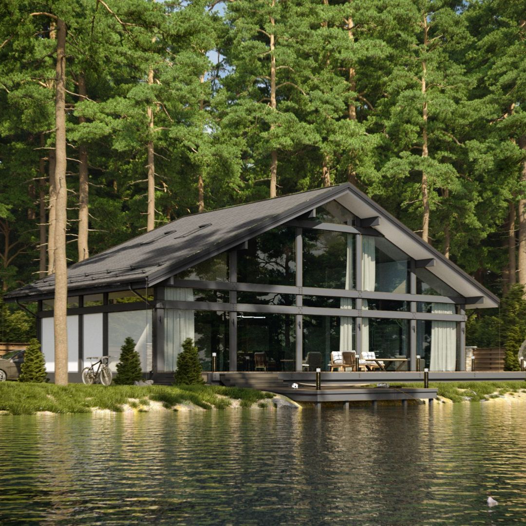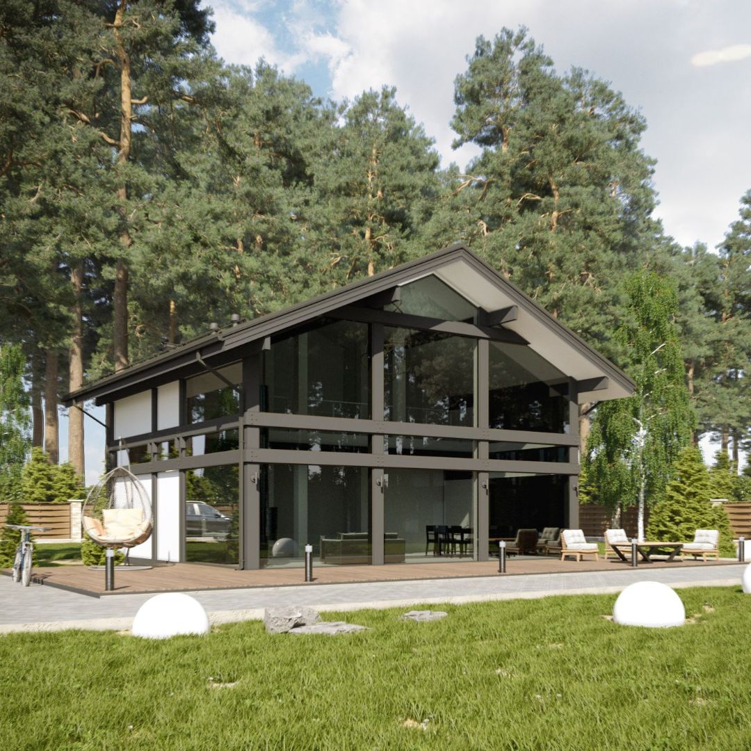 В базовую комплектацию сразу включаем двухкамерные стеклопакеты панорамного остекления, комплект PIR утепления, отделку внешних стен, чистовую кровлю с подшивом и водостоком, шумоизоляцию